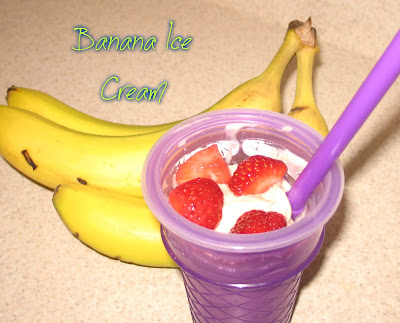 And there you have it......Banana Ice Cream! We put strawberries on ours and mixed them in and it was so yummy and the kids loved it! They thought it was real ice cream!