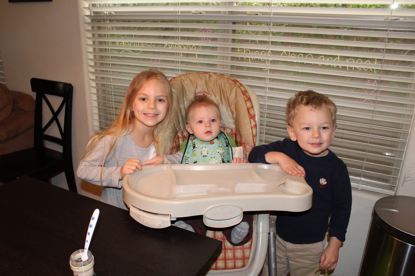 It is fun having a big kid helper this time around. We had Kaylee taking video, Ryan on the camera, and me feeding the baby. Alexa and Nolan were great cheerleaders! Unfortunately the really good video we have is too large in size and won't let me upload. Sadly the one below doesn't even show him liking the bite. The other video had him really liking it. This was at the end when he was all done.